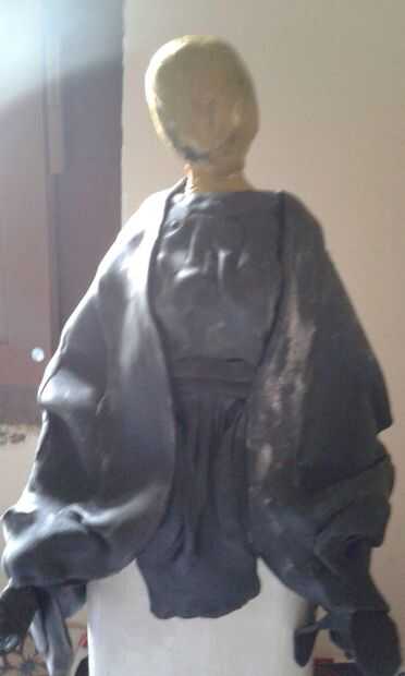 Con un cuchillo afilado corta el laminado capa m-sello y pega en el hombro dándole forma de la parte superior del vestido. En cuanto a la parte baja forma de la de botella cuidar. Luego poner otra capa como chal tanto del lado del hombro.