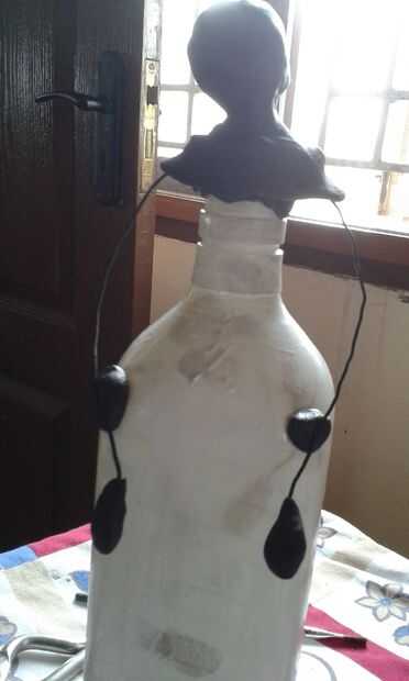 Aplicar sello de M en la boca de la botella para hacer hombros. Dar forma de alambres de metal de las armas y lo pega en los hombros. Apoyar con dos pequeñas manchas de m-seal. También al final ponga m-sello en forma de palmeras.