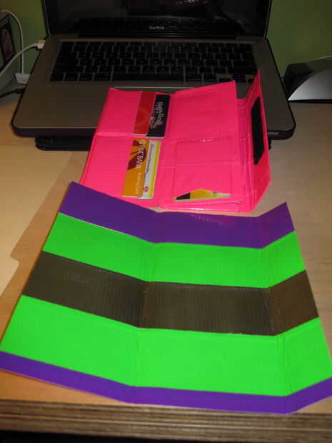 Este consiste en ser doblada en tres secciones. La primera es con las tarjetas, la segunda es el bolsillo para el dinero y el tercero se solapa con velcro. Puedes ver en la cartera terminada. Una vez que llegas, plegar a las proporciones adecuadas. las dos secciones más grandes deben ser aproximadamente 4" de largo.