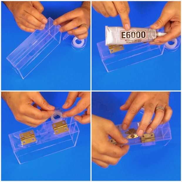 Centre sus bisagras sobre las cajas donde se reúnen y cola les en E-6000 con cinta adhesiva en su lugar mientras seca
