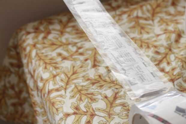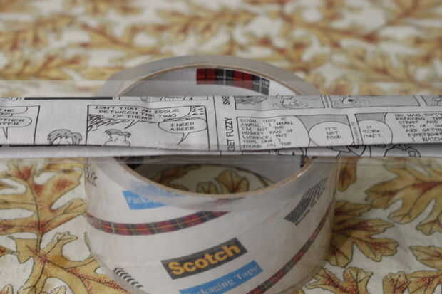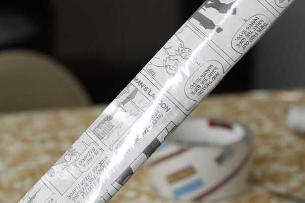 Coloque una tira larga de cinta de envío sobre la tira de periódico y doblar la cinta de envío adicional sobre los lados.