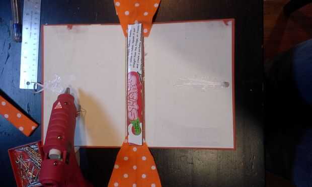 Usar una pistola de pegamento caliente, pegar la punta de las piezas laterales a la columna vertebral del libro.