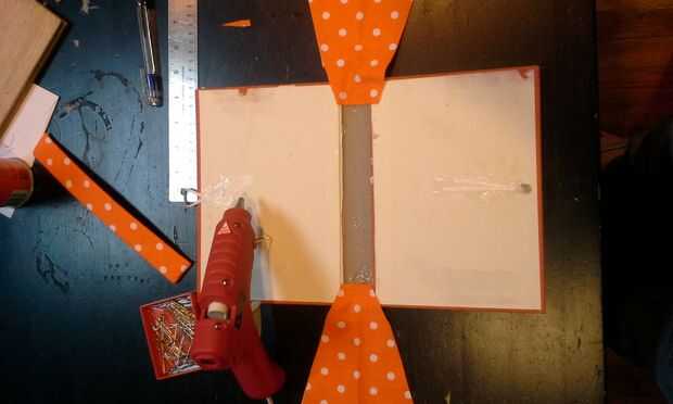 A continuación, tomar el refuerzo cartón (uno no cubierto con la tela) y pegar a la columna vertebral sobre la tela.