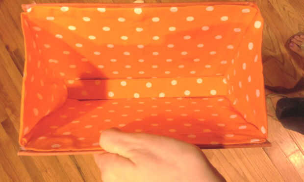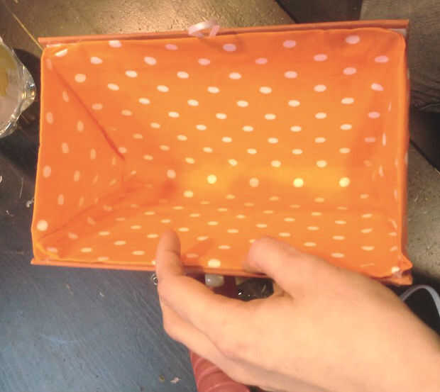 Usando la pistola encoladora, aplicar pegamento en la parte inferior de la armadura de cartón cubierta de tela. Colocar dentro de la bolsa en la espina dorsal del libro.