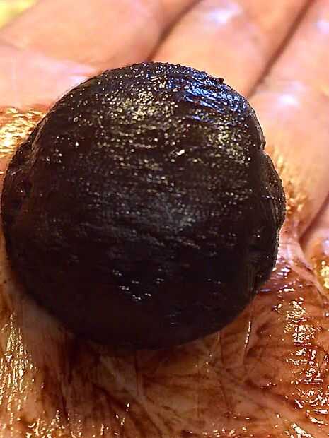 Y ahora la parte complicada: trabajando rápidamente, como el calor de tus manos suaviza la ganache; rollo de la ganache en una bola, (tamaño de una nuez pequeña).