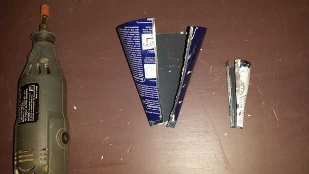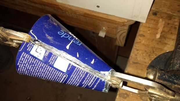 De auxilio-gas o com um alicate de bico, os dois pedaços de lata devem dobrados sollozar un conos de forma dos dois.