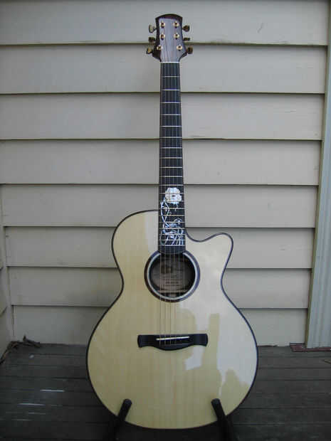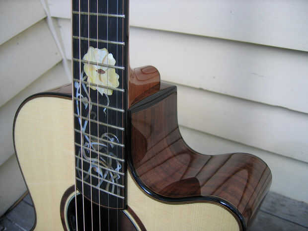 Finalmente, terminado! paso atrás y disfrutar de su nueva creación. Hay tantas cosas que se pueden crear en este medio. Trato de crear uno de un pedazo bueno. Prefiero pensar en la guitarra como un fondo, en lugar de una frontera. No me gusta limitarme a trabajar en las dimensiones confinadas de un cabezal, o tablero del dedo. Intento crear una pieza que es de flujo libre y a veces va más allá de la guitarra sí mismo. Espero que se inspiró para crear su propia pieza con incrustaciones.