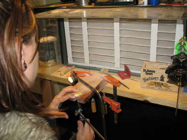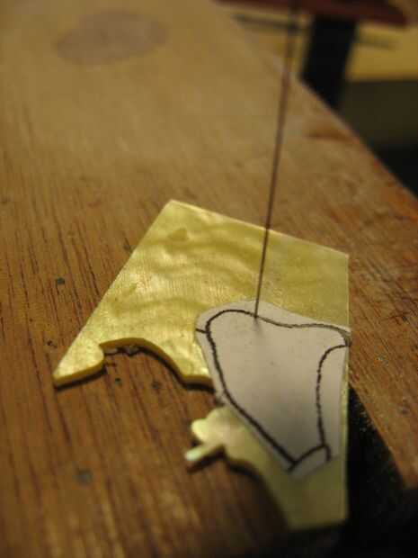 Seguir cortar todas las piezas y mantener en orden para pegar. Puede retocar la pieza con un pequeño archivo. Mantenga sus piezas en el borde del bloque y lime los filos, sujetando el archivo recto hacia arriba y hacia abajo. * La clave para limpiar incrustaciones de trabajo es, líneas rectas y nítidas.