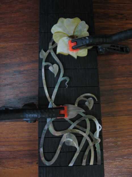 Después de que su pieza es todo pegan, es tiempo de embutido! Coloque la pieza completa en el material que se ajuste en la parte superior. (ej. caja de madera, placa... etc.) Virar en lugar con un pegamento de silicona. (Stix, todo de Elmer funciona muy bien) Este pegamento sostiene apretado, pero le permite levantar la pieza, sin romperla. Mientras que la pieza se viró en su lugar, marque alrededor de la pieza. Asegúrese de que usted marque alrededor de todas las áreas; dentro de bucles cerrados. Utilice el cuchillo X-ACTO para ranurar. * El propósito de este paso es a ti mismo dejar una línea clara a seguir para enrutamiento. Una vez que has ido alrededor de toda la pieza con la hoja, retire la pieza (Deslice una espátula delgada debajo de la pieza encolada) y póngala a un lado. La limpieza de la izquierda sobre el pegamento. Ahora, rellena las líneas de corte/describen con tiza blanca. Debe tener líneas blancas para seguir ahora.