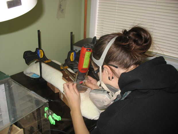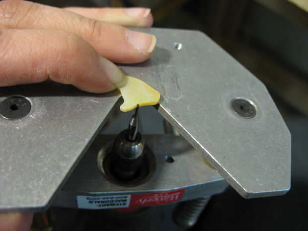 a continuación, tomar tu router y configurar la profundidad de la broca, ajustando la base. Para estar más seguro, hacer esto con el router desenchufado en vez de simplemente apagado. La base tiene dos lados que deben ajustarse, para nivelar la base y ajuste la profundidad de la broca. La profundidad depende del grosor de la pieza. Mantener la pieza plana mientras ajustas los lados. La punta de la broca debe ser sobre nivel con la parte superior de la pieza. (Con el router uplugged todavía, puede ejecutar el dedo sobre la pieza para ver si el dedo coge la broca) La razón para establecer la profundidad de bits es, para asegurar que la pieza será al ras de la pieza que encamina. Si se establece la profundidad demasiado profunda, la pieza se sentará debajo de la superficie. Esto resultará en que la arena a la superficie del material distribuido para llegar hasta la pieza embutida. Si se establece demasiado baja la profundidad, la pieza estará por encima de la superficie y tendrá mucho el color de la arena, y posiblemente de la arena algunas piezas demasiado delgadas!