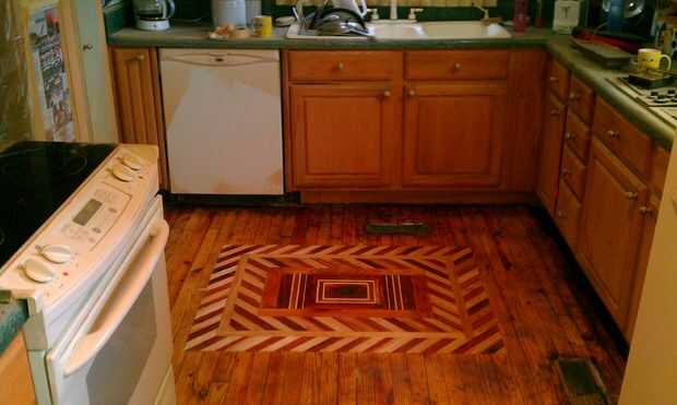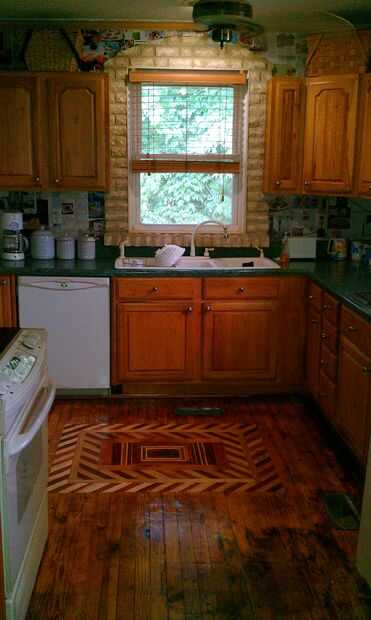 mi cocina tenía azulejos desagradable terrible. Mi esposa arrancada el azulejo y el azulejo se acercó algunas del piso de madera. No fue su culpa. Más propietarios que están intentando algo nuevo por primera vez cortando las esquinas en cualquier lugar... salvo cuando se trata de pegar. No, pegamento que utilizan en exceso. Incluso he encontrado cola en los sistemas eléctricos en mi casa. Aquí es cómo me fijo mi piso y una incrustación, Enjoy!