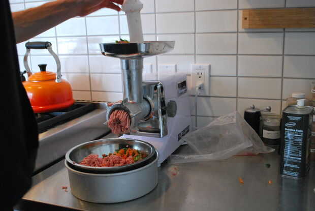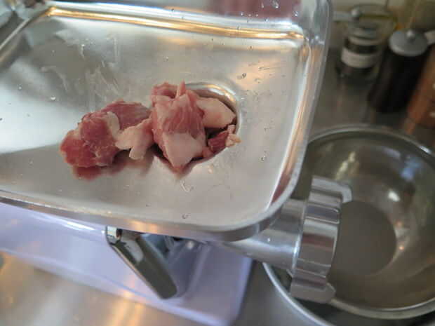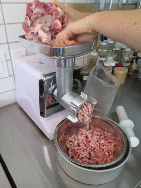 Antes de hacer salchichas el encuentro debe ser tierra. Utilizamos una amoladora eléctrica porque moler la cantidad de carne que utiliza para salchichas habría sido una tarea real con una amoladora de mano. Es mejor mantener la reunión semi congelados cuando para obtener la consistencia correcta. Si estás haciendo salchichas en lugar de salchichas moler la carne varias veces para obtener una textura más fina, más homogénea.