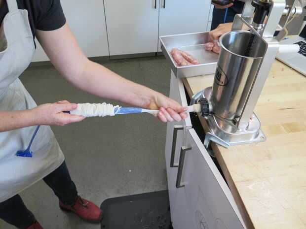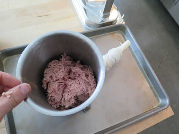 A continuación, simplemente llene la tolva en su prensa de salchichas con la carne molida y colóquelo debajo del émbolo. En nuestras salchichas agregamos una variedad de diferentes tipos de especias y frutas para acentuar el sabor. Duraznos y manzanas fueron las más deliciosas pero los arándanos y las cerezas eran bastante grandes también.