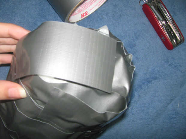 Ahora, trabajar en cubrir encima de todos los bits de bolsa de papel que se sigue mostrando. Al llegar a la parte inferior y superior de la forma oblonga, use más cortas tiras de cinta adhesiva ya que mienten planos más fáciles que los largos.