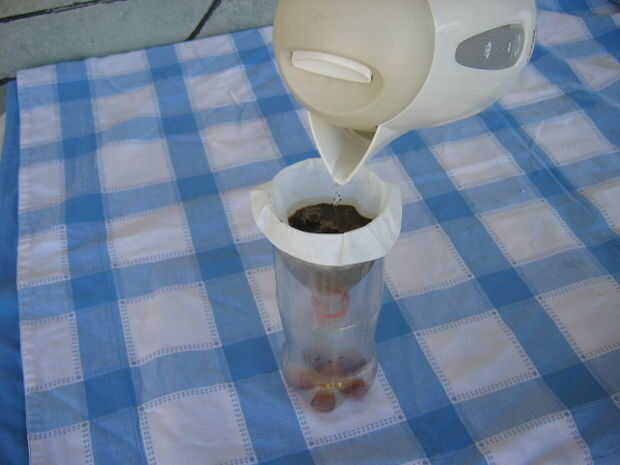 Algunas veces usted necesita realmente una taza de café y no es una goteo ordinario cafetera a mano (por ejemplo viajar, café fabricante se rompió, etc..). Hay una solución simple. Toma una botella vacía de plástico de refresco y cortarlo en dos piezas. Poner el filtro de papel cuidadosamente en la parte del embudo. A continuación ponerlo en la parte superior de la otra parte. Agregue el café y empezar a ronronear agua caliente poco a poco. En pocos minutos el café está listo!