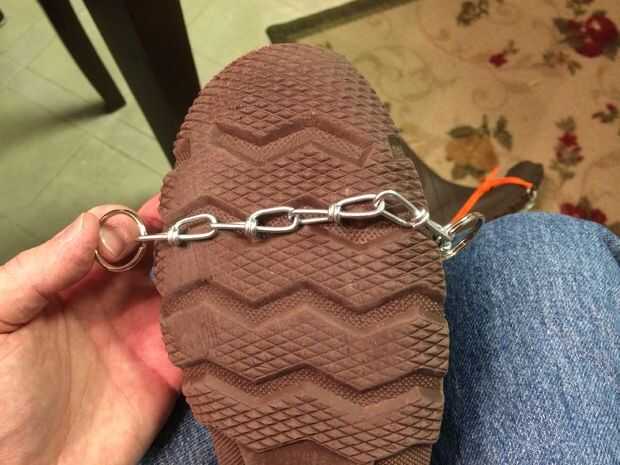 Los dos conjuntos de crampones para cada arranque son imágenes de espejo uno del otro. La bota izquierda se ilustra aquí. Con cualquier boot inicio el final de la cadena en el frente * interior * borde, en la parte inferior aproximadamente donde la bola del pie sería. Traer la cadena horizontalmente a través al otro lado del dedo del pie, gire a la y hacer una larga diagonal "Z" en el interior del talón y luego otra vuelta para poner la cadena en el talón. Es mejor dejar un poco de cadena extra que usted puede cortar al final. Le puse un anillo en cada uno de los cuatro puntos en la "Z" para hacer más fácil atar en el paracord.