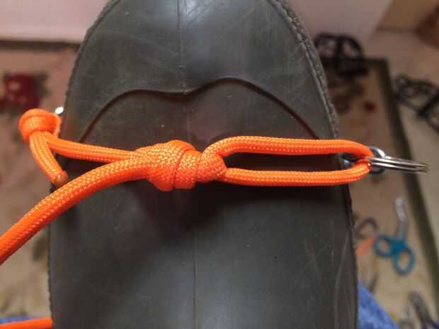 Los crampones utilizan dos trozos de cable para fijar la cadena a la bota. La correa de la punta es un trozo pequeño de cable en la parte superior del dedo del pie, conectando cada uno de los anillos de split por debajo, como muestra la imagen. Hacer un 'bucle volado' en el extremo de la cuerda para atar al ARILLO exterior primero. Ejecute el cable sobre el dedo del pie y lazo nudo de enganche a Blake para el arillo en el interior borde de la bota. Hasta que finalice todo deja una larga cola en esta pieza se cortaron. Usted puede encontrar un montón de grandes videos en la web para el 'bucle volado' y 'Tirón de Blake'. Enganche de Blake es un nudo muy útil que se puede ajustar más flojo o más restrictivas. Esto es útil porque queremos que los crampones para adaptarse a lo que pasar a llevar los zapatos. Planificación para un peor en que probablemente debe hacer el ajuste para cualquier calzado es más propensos a conducir. Si te agarra en el trabajo o fuera de su coche no podrá realizar ajustes como se podía en casa.