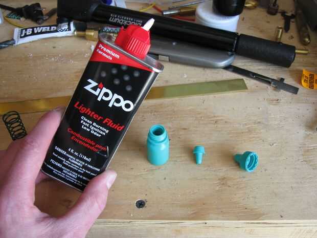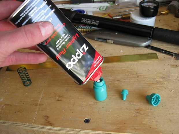 Una vez seco el gotero, el líquido (preferiblemente) encendedor Zippo y vierta algunos. No necesitas una tonelada. Esto es sólo para uso de emergencia. Una vez que haya una cantidad suficiente en el interior, vuelva a insertar la punta. Vuelva a enroscar la tapa y eres oro!