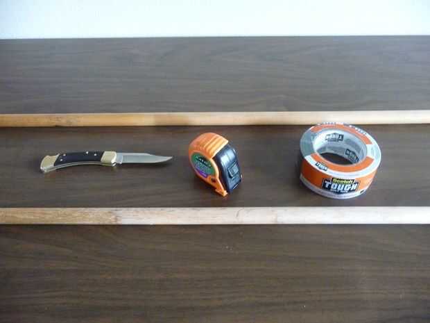Utilicé 2 palos de escoba de empuje, pero en el campo sería improvisar con ramas de los árboles, madera, postes de la cerca vieja, etc.. Si está utilizando pequeños árboles o ramas de los árboles, tira de la corteza según sea necesario y limpie los polos lo mejor pueda. Trabajar con rapidez pero no cortarse. Postes de madera verdes funcionará, pero el secador de los polos, mejor la cinta se adhiere a él.