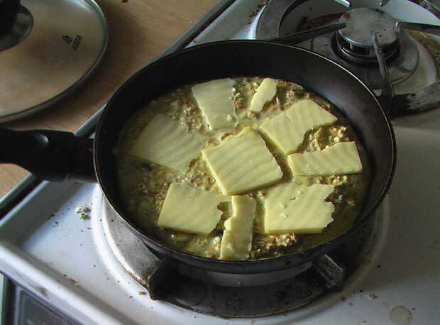 Me gusta poner queso por encima. Cuando se coloca en la parte superior, queso cumple una doble función: en primer lugar, como era de esperarse es delicioso y sabroso, y en segundo lugar, actúa como un indicador - que le dice cómo cocido el cuerpo principal de el BC está dentro. Por supuesto, el indicador ser eficaz, uno debe aprender a 'leer el queso'. Si se mira a través de las descripciones de la foto siguiente puede ser bien en su camino a la lectura precisa de queso.