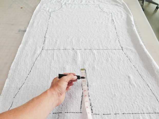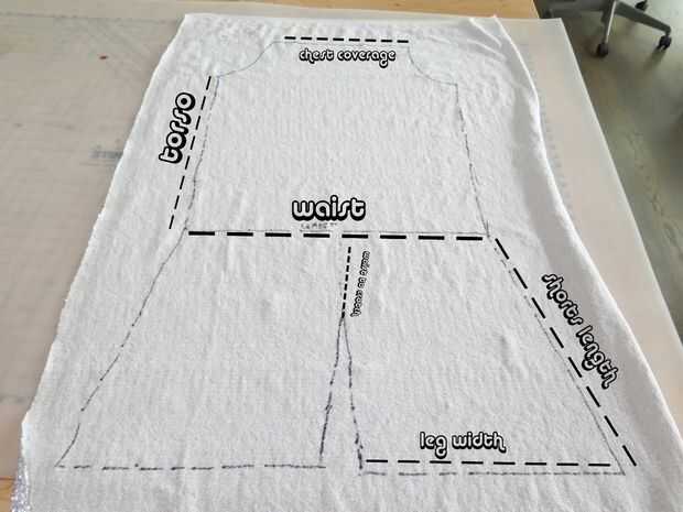 Doble su tela encantadora en mitad de la diversión en. Tomar algunas medidas y dibujar un patrón suelto que se ve como frente de Mario. Medí la cintura, el torso, entrepierna, ancho de pierna, vestido de pantalones cortos y el frente de mi pecho (para cobertura). Comentar las líneas para los ángulos, y usted encontrará tela elástica es bastante indulgente. También puede aproximar cuánto curva para irse a los brazos, pero con monos no tiene que ser muy exacto. Marque hacia fuera!