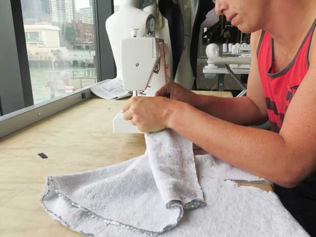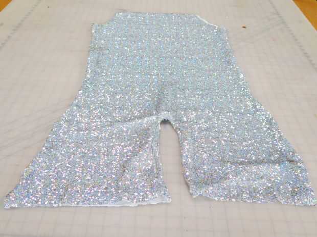 Coser a lo largo de la cara exterior y alrededor de la entrepierna. Deje abierta la parte superior y piernas. Si sientes lujo (y tiene más de 30 minutos hasta la hora del baile), puede Agregar una capa de tejido interior para comodidad o dobladillar los bordes. De lo contrario, tres líneas en la máquina (uno es una V) y listo! También podrás hacer extra brillo por todo el lugar! Darle la vuelta y echa un vistazo!