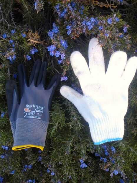 Utilizando unos guantes de goma fina que tenía, cubierto les con guantes de algodón para aislar la goma. Trabajó muy bien para el viento frío y sin humedad. Sería inútil if agua donde participan. Oh mira el Romero es de floración. Su tan frío!