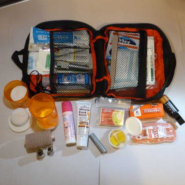 El Kit de primeros auxilios - encontré el bolso en una farmacia local gratis y cargado con elementos que ya tenía.