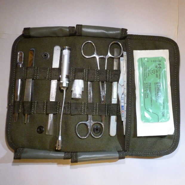 - Kit de hilo de sutura (Ethilon en una aguja curvada, igual que en la sala de emergencia)