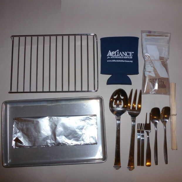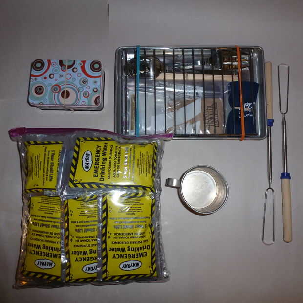 También tengo una bandeja poco profunda de aluminio con una rejilla en la parte superior. (Creo que era una bandeja de asar en un horno tostador. Lo encontré en una venta de garaje y me pareció perfecto para este kit) también es una copa de aluminio y 2 horquillas extensibles de tostado. Puedo usar la taza para hervir agua o calentar los alimentos y las horquillas para tostar para cocinar cualquier alimento que pueda sobre una llama abierta sin arriesgarme quema. También son capaces de ser lavado y reutilizado.