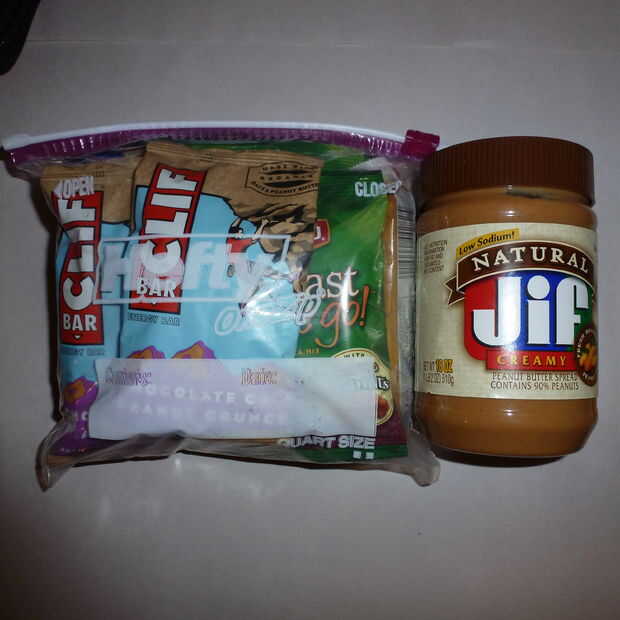 Para el alimento, tengo un bote lleno de mantequilla de maní, diversas proteínas o barritas, frutos secos y paquetes de tuerca y un montón de paquetes de pura azúcar y miel.