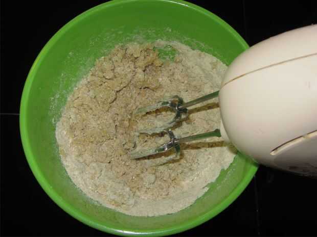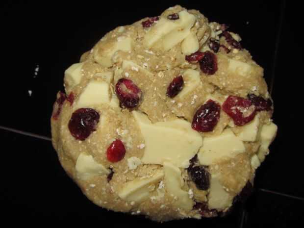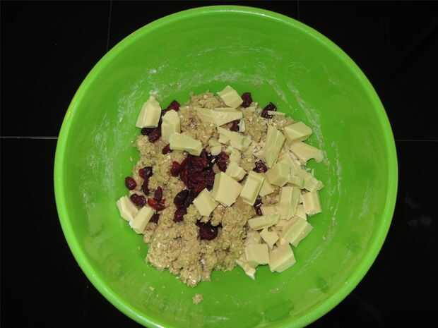 • Añadir ingredientes mixtos, secos a la mezcla de crema. Comenzará a formar una masa. En este punto puede agregar sus extras (como los trozos de chocolate blancos y arándanos) y recoger la mezcla en una bola con las manos.