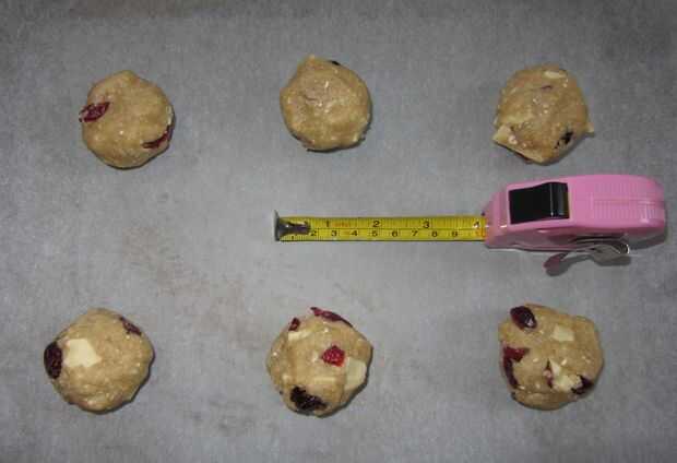 • roll en bolas 1½-5cm/4 "de diámetro.  Cubrir una bandeja de horno con papel parafinado y colocar las bolas de masa de galleta sobre él con espacio entre ellas (tiendo a cocinar seis a una bandeja).  Aplanar las bolas un poco con la mano antes de poner en el horno.
