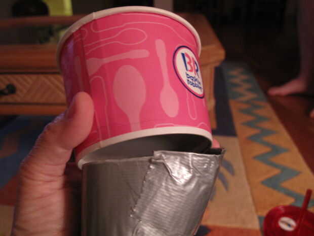 - Trabajar su camino alrededor del borde con pequeñas tiras de cinta adhesiva para sujetar el rollo en su lugar, manteniendo el rollo en el lado exterior de la Copa. Una vez que el rollo esté en su lugar, cubrir los huecos entre las tiras pequeñas de cinta con cinta adhesiva adicional. No quiero el embudo al colapso.