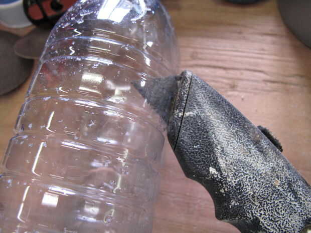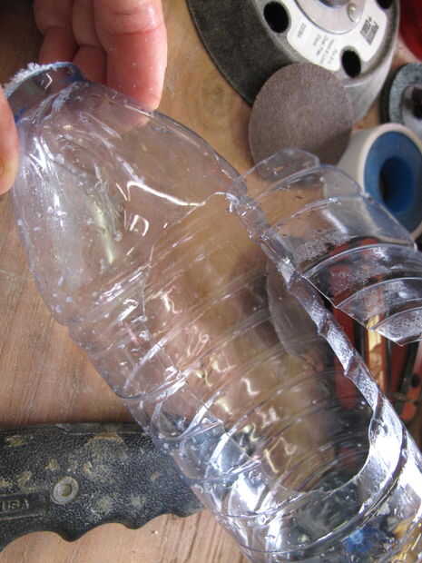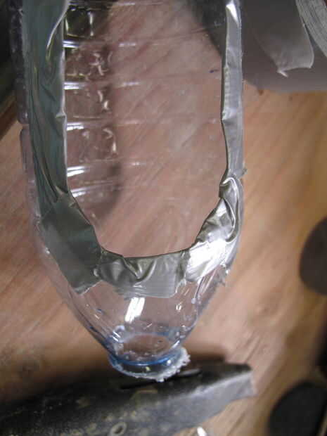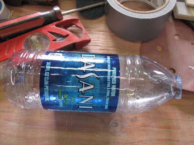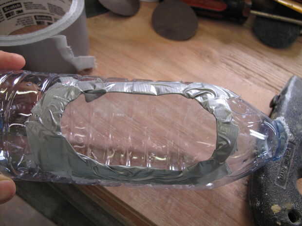 Asegúrese de que esté seco el interior de la botella alrededor del agujero. Utilizar pequeños trozos de cinta adhesiva para cubrir el borde de corte. El plástico puede ser agudo.