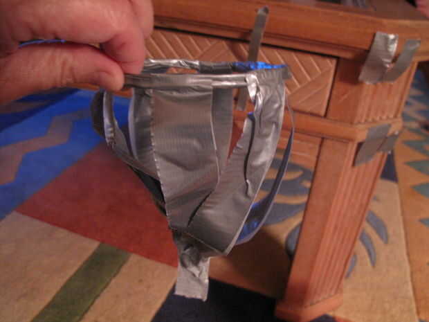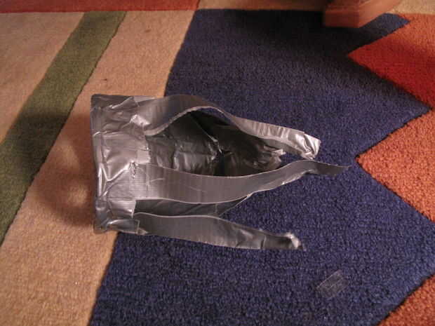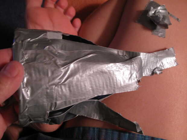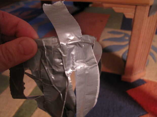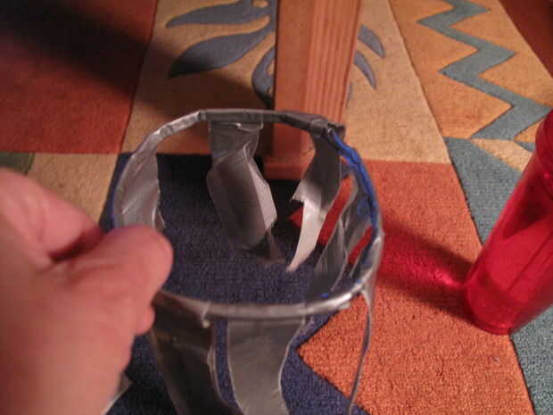 Coloque el cono sobre su lado, con la parte más ancha en la parte superior de este pedazo de cinta del conducto y la parte del cono firmemente contra la pieza de cinta adhesiva.