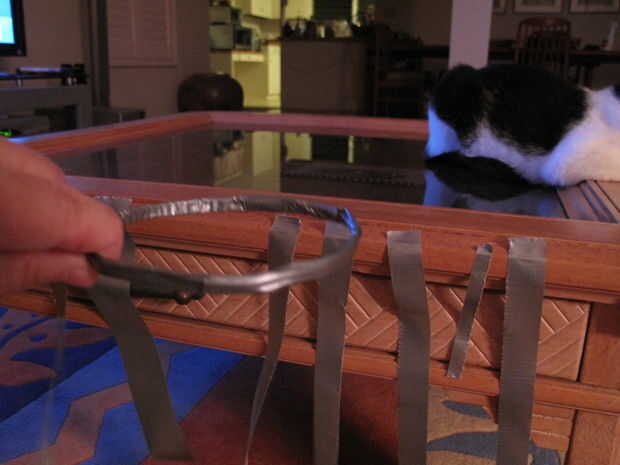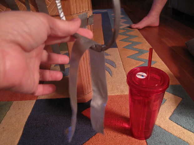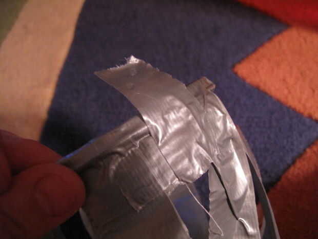 Obtener varios pedazos de cinta adhesiva y rasgar por la mitad longitudinalmente.