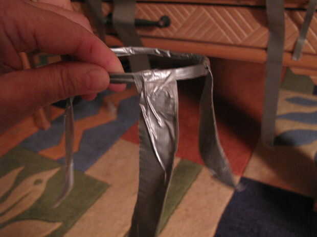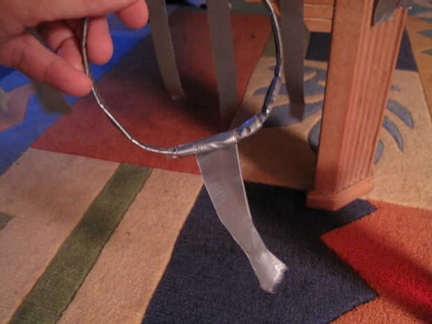 Tomen las ocho puntas que están sueltas y pizca de juntos. Puede haber suficiente adhesivo sobresale que sostienen juntos ligeramente. Si no, tomar un pequeño trozo de cinta y péguelos juntos. Si mantiene el anillo horizontal al suelo, la pieza debería verse como un cono invertido o un embudo (lo llamaremos un cono).
