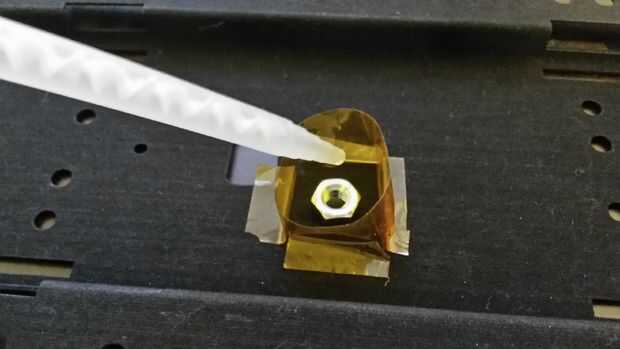Coloque la tuerca de 1/4-20 dentro del cuerpo de plástico en la parte superior del orificio grande en el centro. Construir un muro de Kapton alrededor de la tuerca con sobre un. 25" de gap y no deje que la cinta toque la tuerca. Asegúrese de la tuerca en el agujero del centro.
