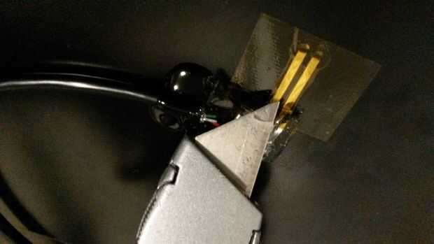 Doblar las puntas hacia el lado y lugar Kapton cinta sobre lo expuesto conduce a que no están siendo soldadas a. Esto protege cables expuestos de la humedad. También puede aplicar epoxi a ellos, pero tomaría más tiempo. (Tener el cable USB sale desde el lado crea un lazo de servicio dentro del cuerpo plástico dándole un efecto de cable retráctil)