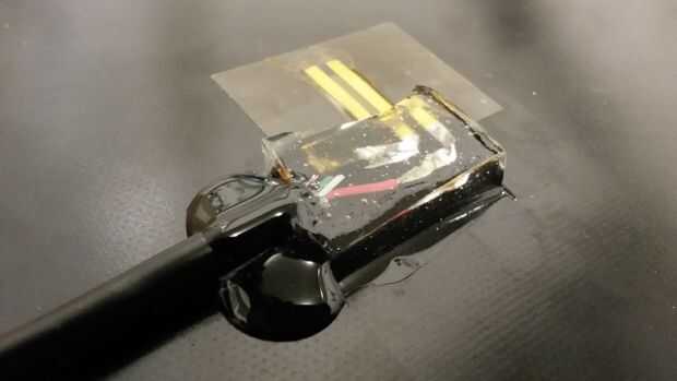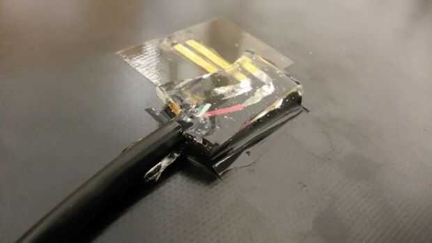 Construir un muro de cinta Kapton alrededor de los cables soldados y cable con sobre un. 25" espacio alrededor de los conductores. Esta pared contiene el epóxico, que actúa como un alivio de tensión de cable y sellador de agua. Asegúrese de la chaqueta del cable dentro de la pared de Kapton para hacer un buen protector.