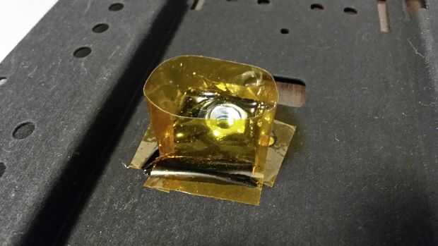Llenar las paredes de Kapton con epoxy para que apenas cubra los cables y hasta la tuerca 1/4-20. Se llenan los bolsillos LED casquillo epóxico asegurándose de que las ataduras están en el bolsillo. (Una caja de cartón con una ranura de corte fina funciona bien para la celebración de los cables en su lugar.)