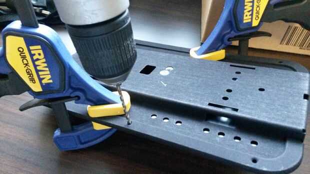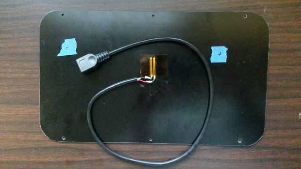 Suelde el cable USB rojo al positivo cable y el cable negro al cable negativo. Empuje los cables para ser plana como sea posible. (Cuando el panel se sujeta al cuerpo plástico durante el montaje final, no quieres el de epoxy sobre los cables para golpear la tuerca 1/4-20)