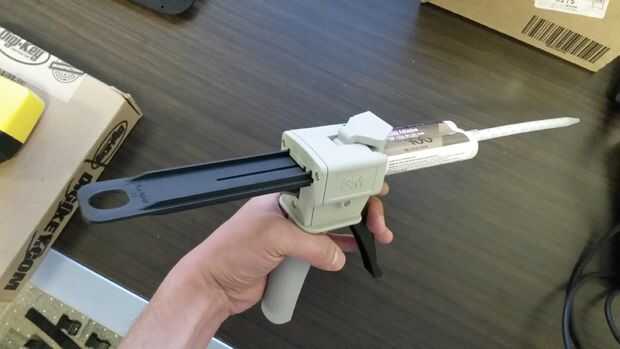 Instale la boquilla de mezcla a la pistola aplicadora. Lo ideal sería que desea utilizar una pistola aplicadora para este paso llegar espacios reducidos. Es posible hacerlo sin una pistola aplicador, pero podría tomar más tiempo y ser más sucio. De cualquier manera, asegúrese de tener algunas hojas de plástico para trabajar y descansar el aplicador de epoxy abajo a coger cualquier derrame de epoxy. Este epóxido tiene un tiempo de trabajo de 5 minutos y endurece rápidamente, razón por la cual todas las partes están preparadas para epoxy primero. Tratar de mantener el flujo en el inyector de epoxy o endurecerán dentro prematuramente y que tienen que sustituir la boquilla. Como endurece, el epoxi te caliente, que es una reacción exotérmica normal. Si epoxy derrames en algo, asegúrese de limpiar inmediatamente antes de que endurezca. También, epoxy puede emitir un olor fuerte por lo tanto, asegúrese de trabajar en un área ventilada.