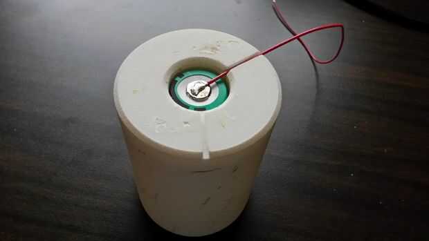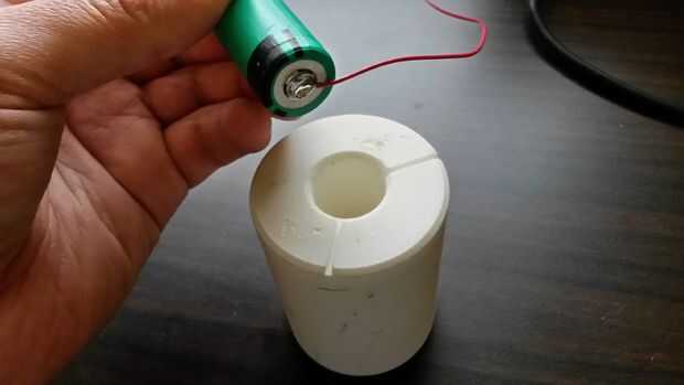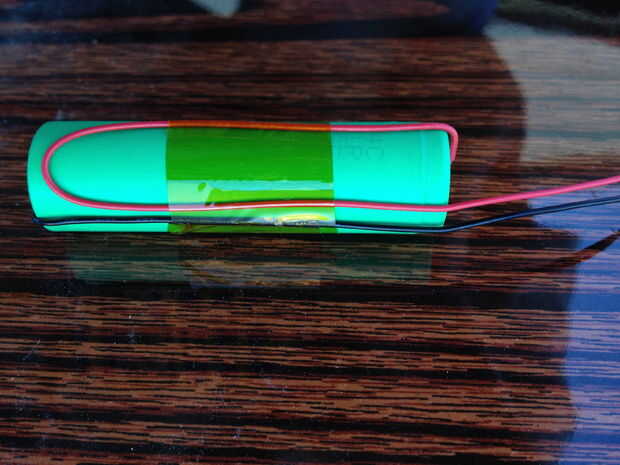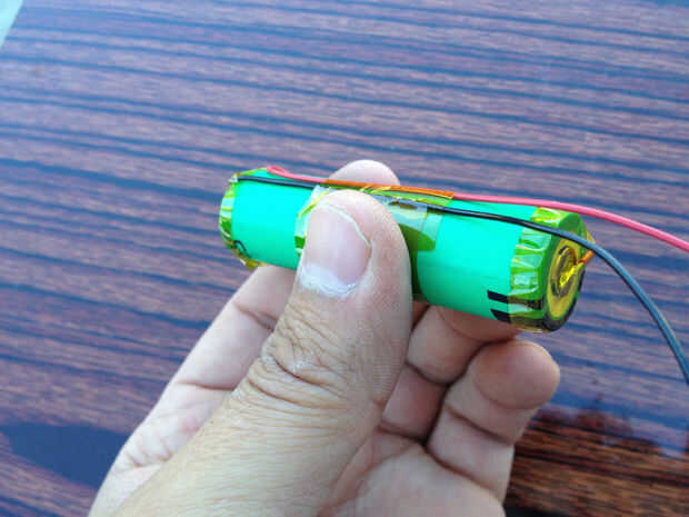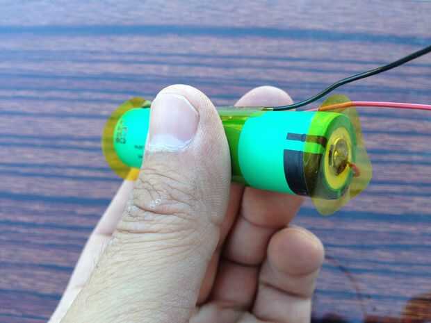 El cable negro de la curva hacia abajo sobre el borde del extremo negativo de la batería y guiar el cable rojo con lazo en el lado de la batería. El efecto debe ser que el cable rojo hacia abajo desde el extremo positivo de la batería es 120 º aparte donde se unen los cables negro y rojo. Esta geometría de alambre permite los cables positivos y negativos salir del mismo lado y da el calce dentro del tubo de aluminio sin ninguÌ n pegamento.