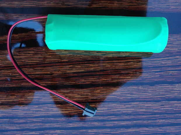 Después de soldar, incline el aparato y presione la batería hacia fuera de debajo con el dedo. Voltee la pila e inserte la batería en el aparato con el cable rojo en el canal rojo y el extremo negativo de la batería hacia arriba. Prensar el extremo de la Red de alambre con el pasador de Hirose e Inserte el pasador al puerto 1 del conector de 2 pines de Hirose. Que desea adjuntar el conector en este punto ya que es peligroso dejar un extremo desnudo colgando de un cable de la batería expuesto y puede causar un corto o quemaduras si toca el extremo negativo de la batería. Lugar el. 20" extremo pelado del negro largo de alambre en el foso de etiquetado - BLK y soldadura alambre el negro a la batería. El extremo negativo de esta batería requiere generalmente más calor a la soldadura porque hay más superficie en contacto con la masa de la batería, pero trate de soldadura rápida. Si hay cualquier soldadura sobresale, suavizar con el soldador.