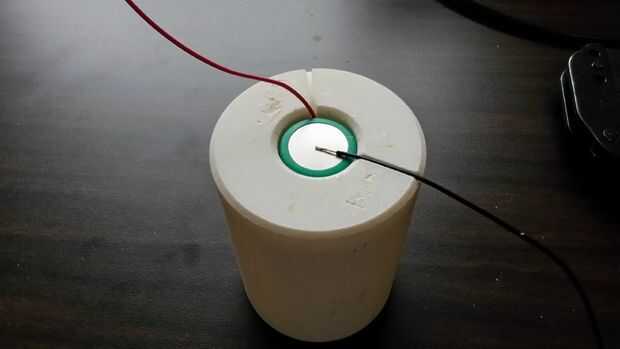 Inserte la batería de NCR18650B en a la potencia base de batería con el lado positivo hacia arriba. La luminaria alineará el rojo y negro los cables como de la soldadura. No toque el soldador y la armadura, porque puede derretir. Es posible que pueda soldar la batería sin el accesorio, pero es mucho más difícil y se necesita algo para mantener la batería caiga. El aparato puede utilizarse también para otros proyectos de la batería.