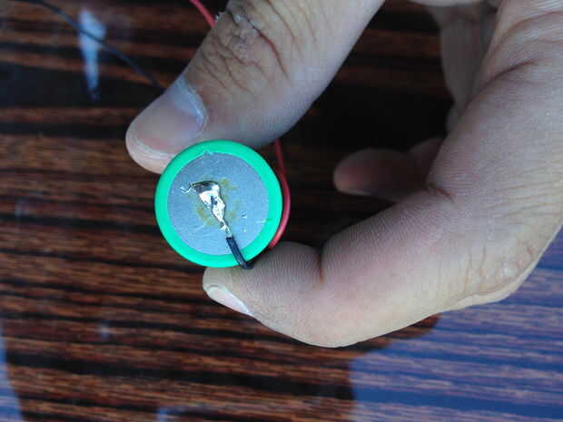 Lugar el. 20" extremo desforrado del rojo largo cable en la zanja con la etiqueta + rojo y el rojo de la soldadura de alambre a la batería. Tratar de soldar a la batería rápidamente porque puede dañarlo demasiado calor a la batería. Si hay cualquier soldadura sobresale, suavizar con el soldador.