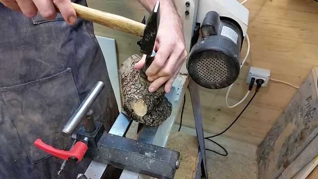 Mirando el ángulo y la forma de la madera, elige un lugar que parece correcto, en el centro, y un martillo el centro impulsor. Usted necesita para asegurarse de que los dientes de la unidad están agarrando la madera y no sólo de la corteza. Después de que el coche se encuentra, puedes medir su ángulo alineando el mango del martillo a la unidad y ver cómo atraviesa la madera. Esto sería un buen momento para ajustar para el ángulo que usted elija es mejor para usted.