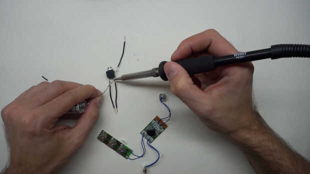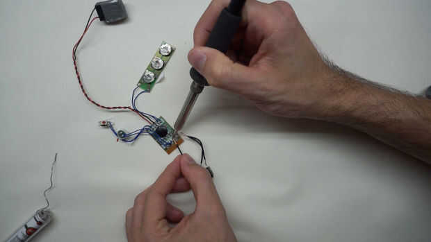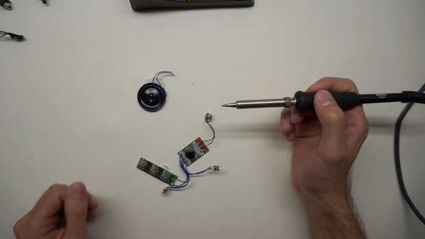 Desoldar el altavoz que viene con la tarjeta de felicitación. Soldar los cables a la toma de auriculares de 3,5 mm y luego esto de la soldadura para el módulo de sonido. Orientación del poste no importa pero debe soldar ambos cables de los auriculares izquierdo y derecho juntos para audio mono.